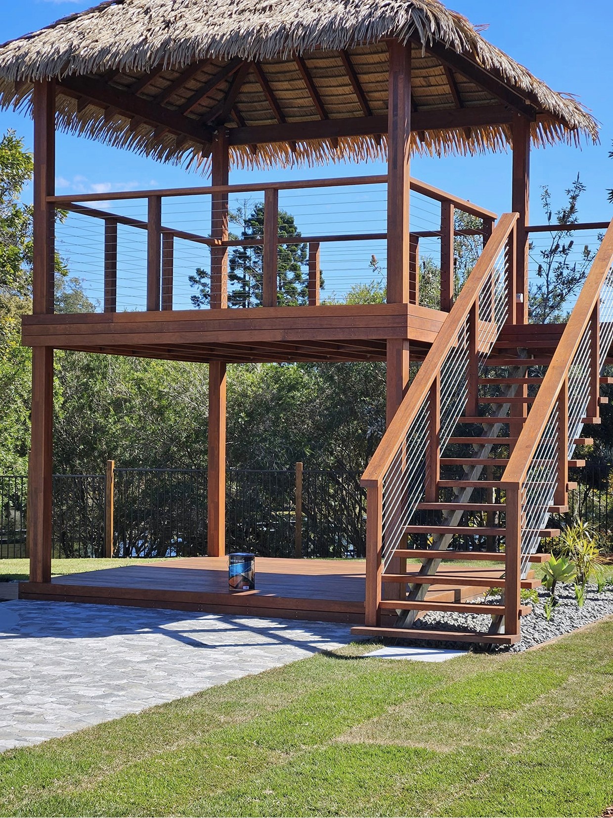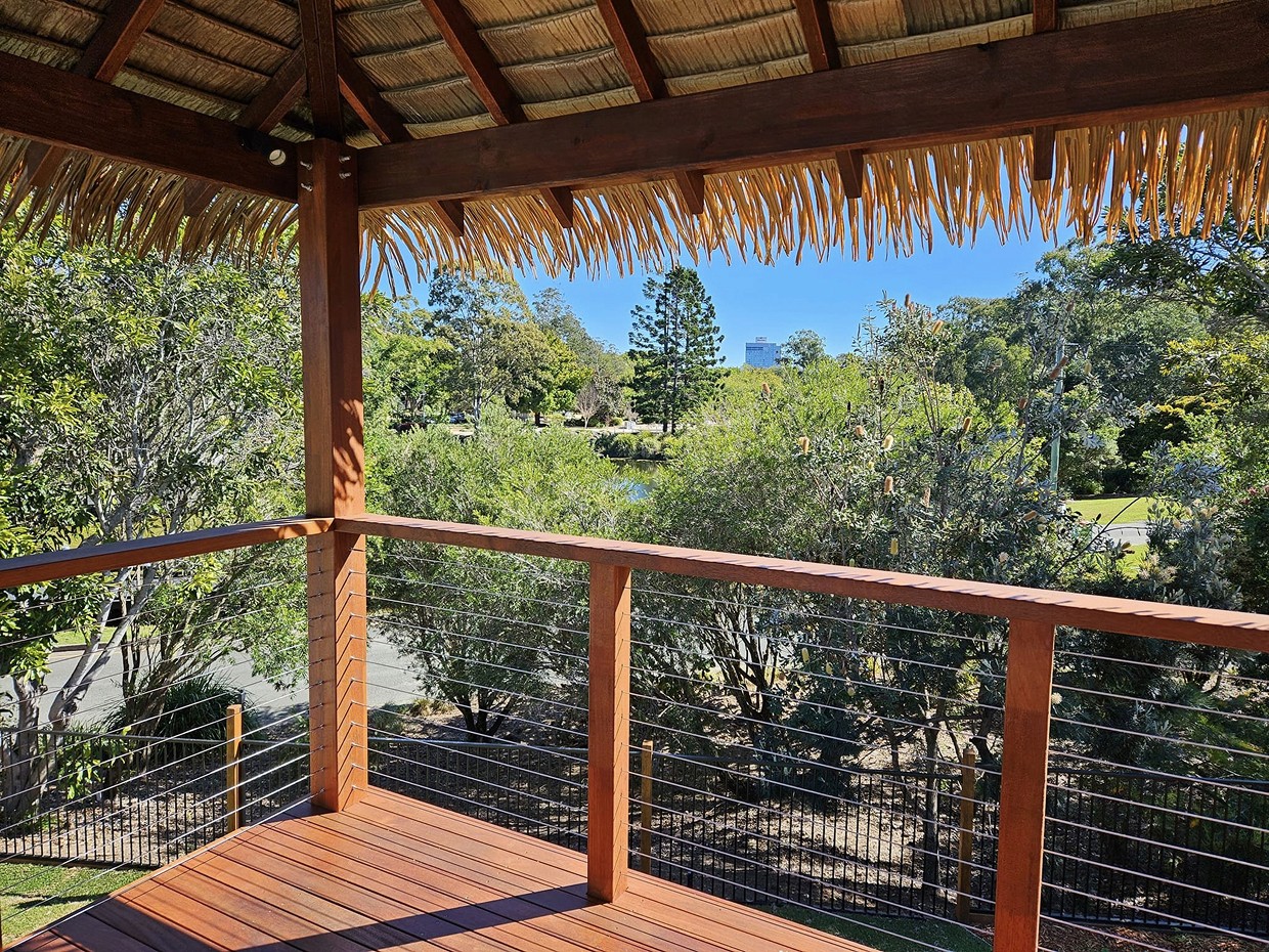 Raised timber meditation retreat with stairs, balustrade, and thatched roof structure