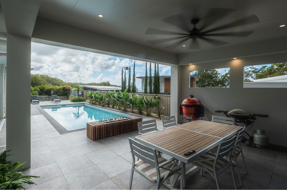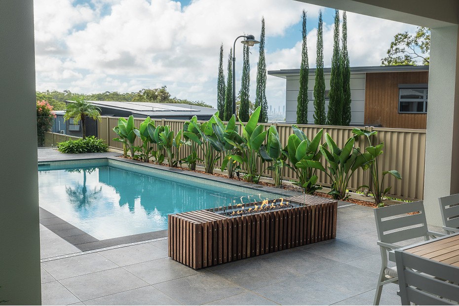 A poolside entertaining area built from a blank canvas after the new build and pool install. We worked alongside the builder delivering the pool pavilion, then brought the space together with clean tiling, coping, a gas fireplace feature, timber batten screening, and lush tropical planting to soften the hard lines and create privacy.