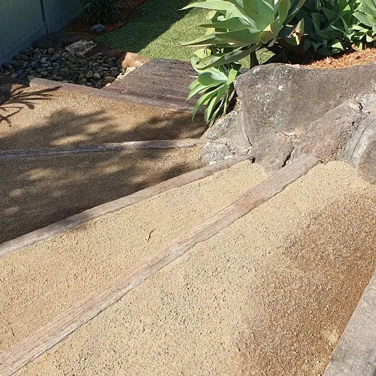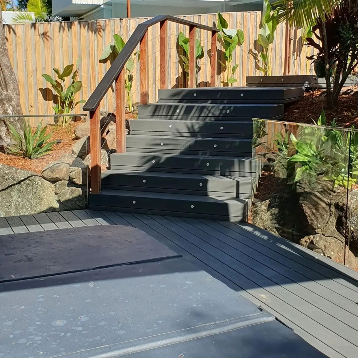 Create a stable, engineered base for a new swim spa and finish the area with a clean, low-maintenance deck and balustrade. The space also needed better access between levels, plus an outdoor shower and a softer garden and lawn area below to compliment the structural elements.