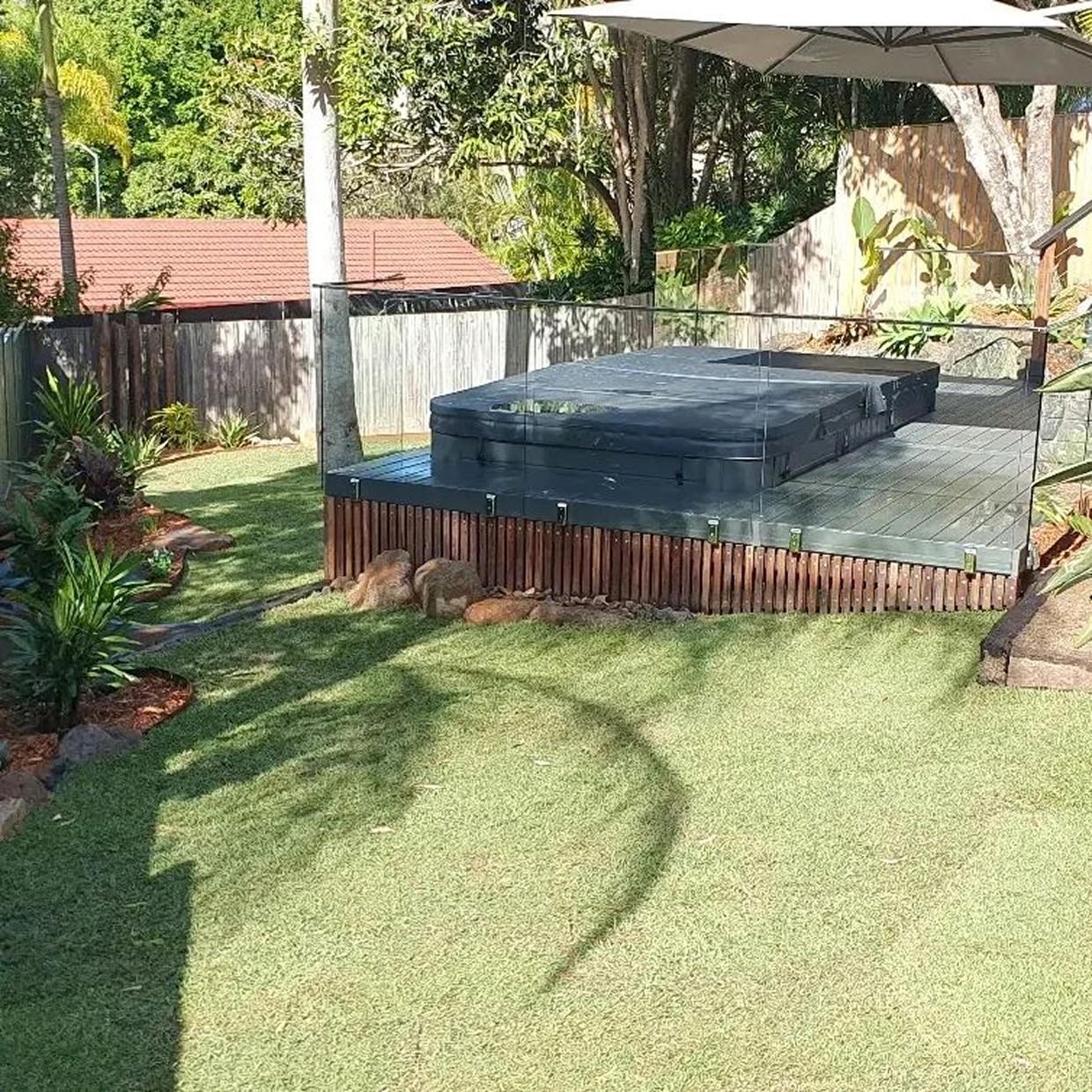 A backyard renovation and the installation of a swim/spa, designed and constructed by us.. We created a clean, durable platform with composite decking and glass balustrade, then softened the space with native gardens and lawn below.